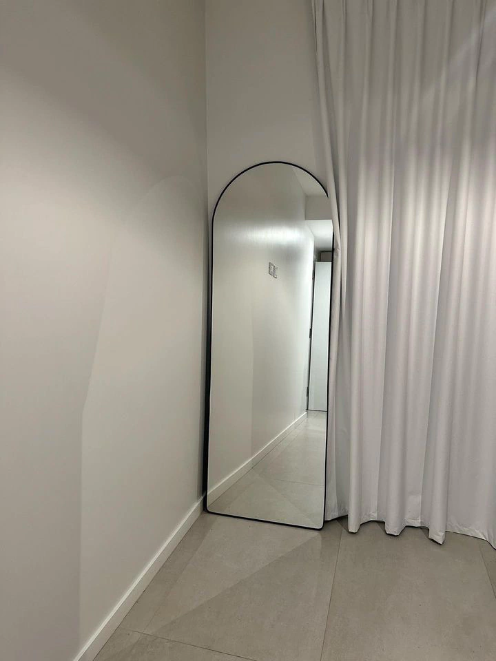 Con forma de punto medio, el arco superior de esta pieza brinda un detalle de estética y elegancia para espacios amplios, vestidores y locales comerciales de estilo moderno. Cuenta con un burlete de PVC que lo convierte en un espejo apto para interior y exterior. Disponible en colores blanco y negro. Se puede utilizar apoyado en el piso y la pared u optar por mantenerlo colgado para inrementar espacio.